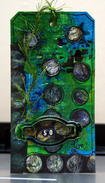 Bakgrunnen er laget med sort og hvit gesso, rød colorwash, stensiler fra Dyan og andre fra Crafters Workshop. Sort og hvit penn samt india ink.