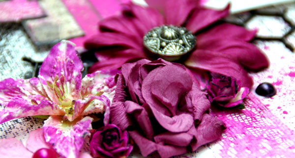 I really liked the sketch at Skissedilla this time. Loved how the elements was placed on the sketch! I've used Dylusions inks, pink and black both on the background, the pattern paper, with stencils, the flowers and the lace.